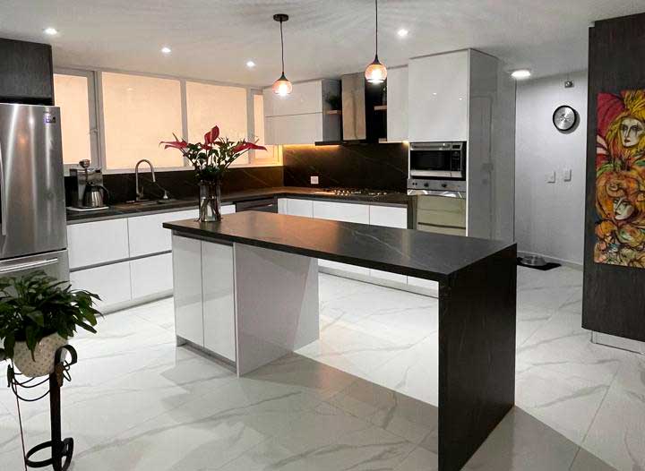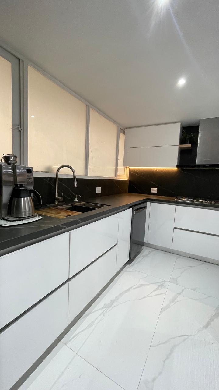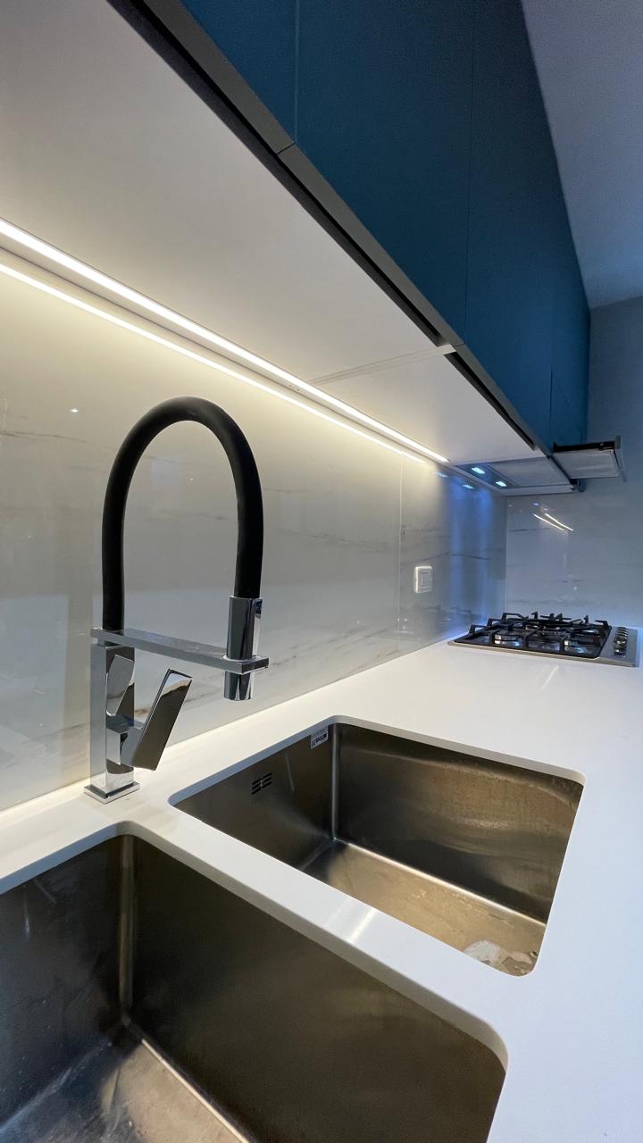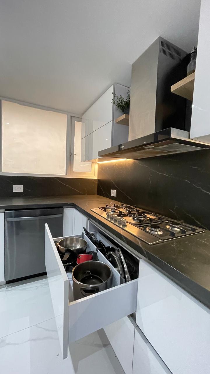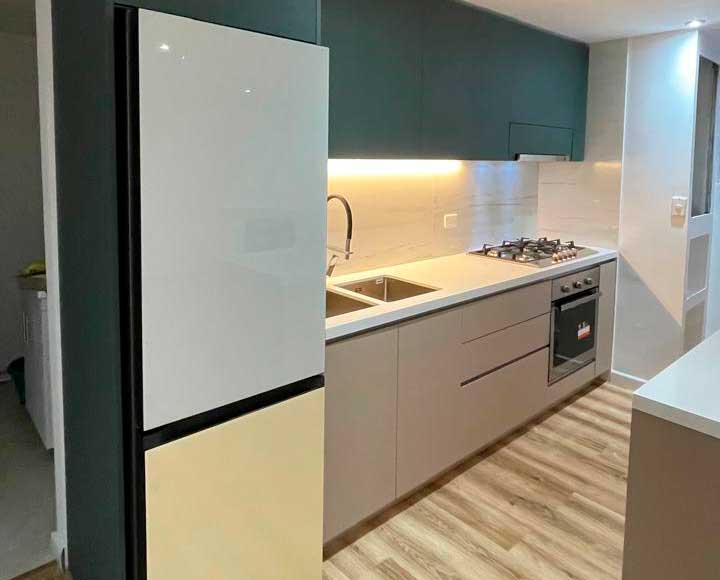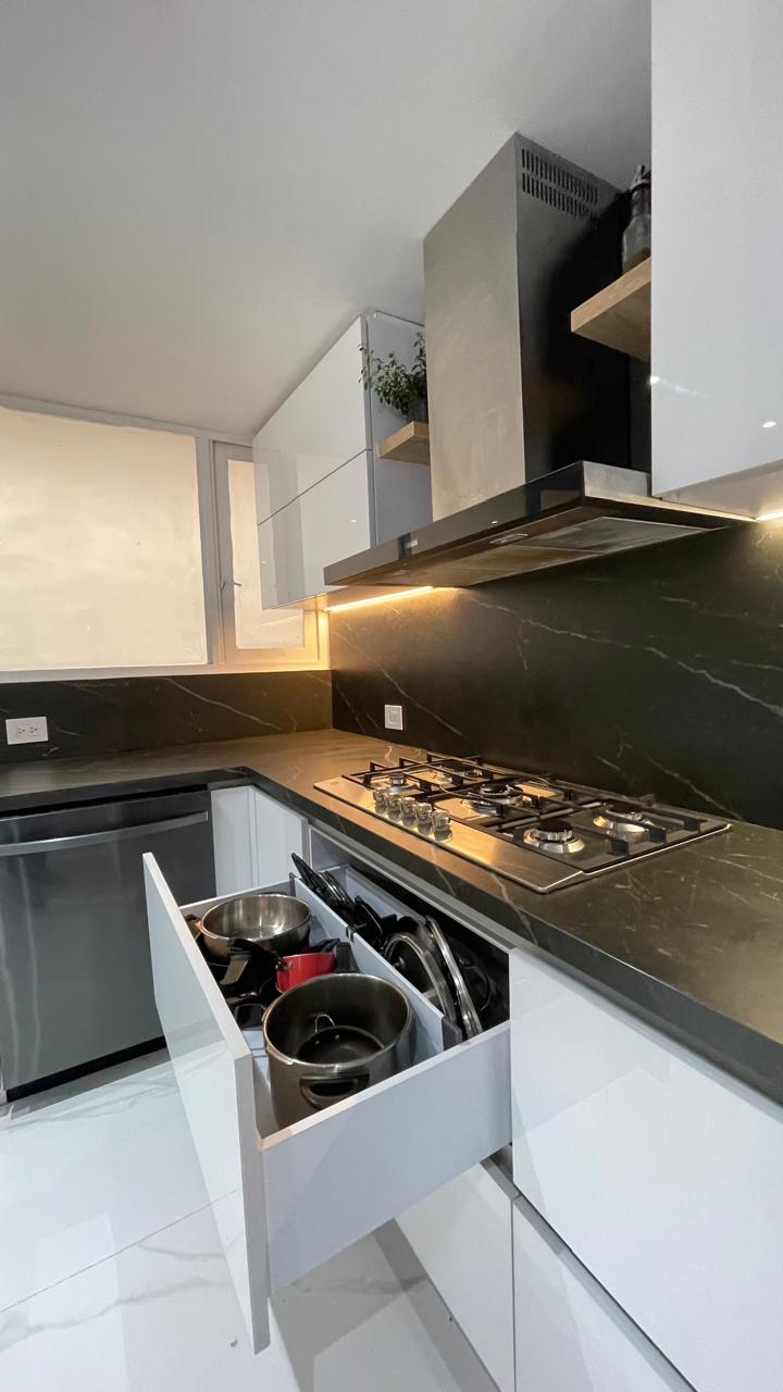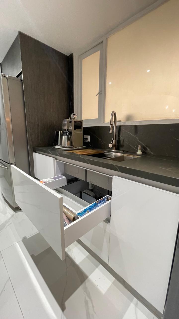 Los cajones y herrajes alemanes certificados, junto con bisagras de cierre lento, aportan una experiencia de uso silenciosa y confiable. Su mesón sinterizado ofrece la más alta resistencia y un acabado que eleva cualquier proyecto a un nivel de lujo técnico.