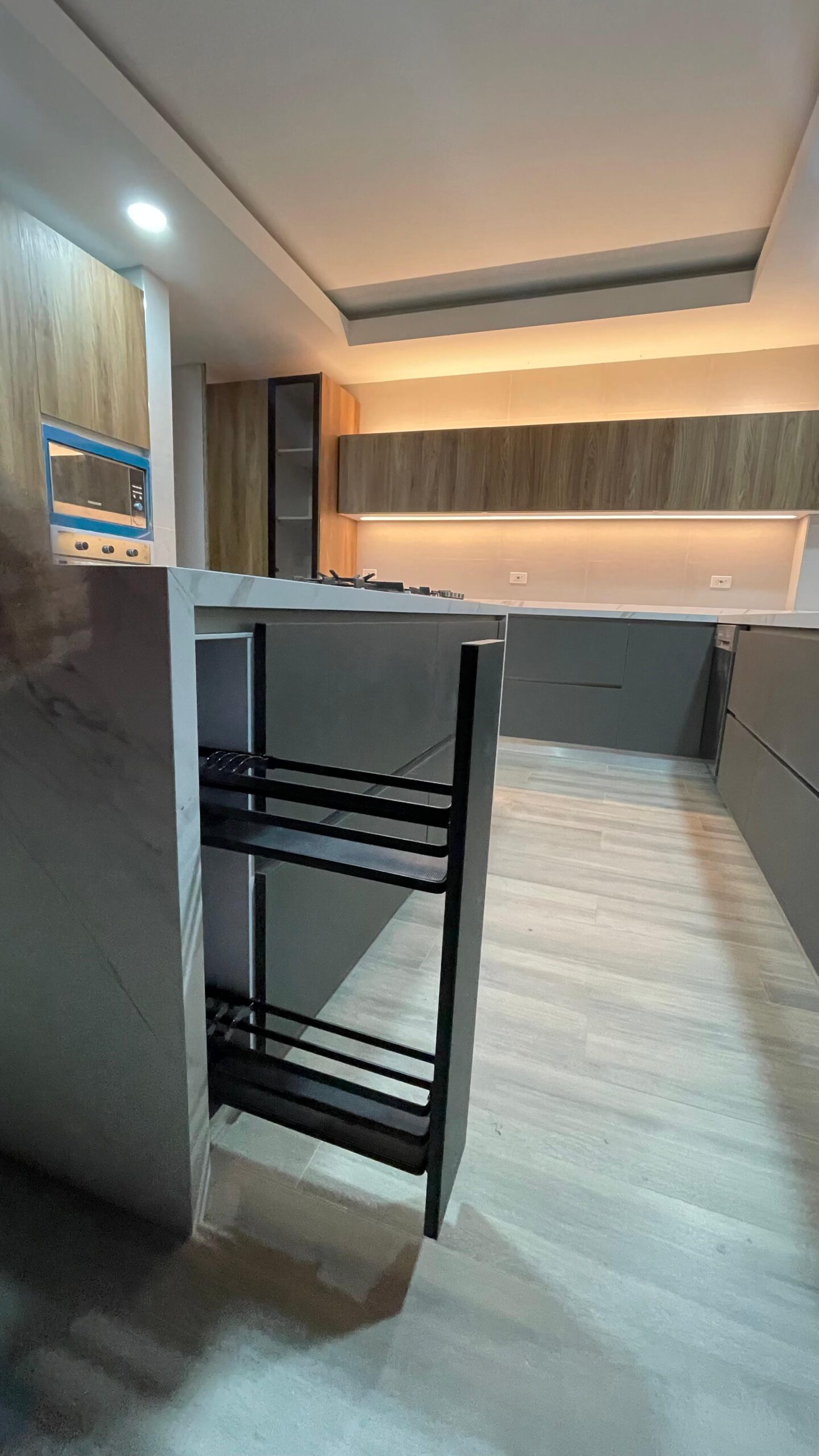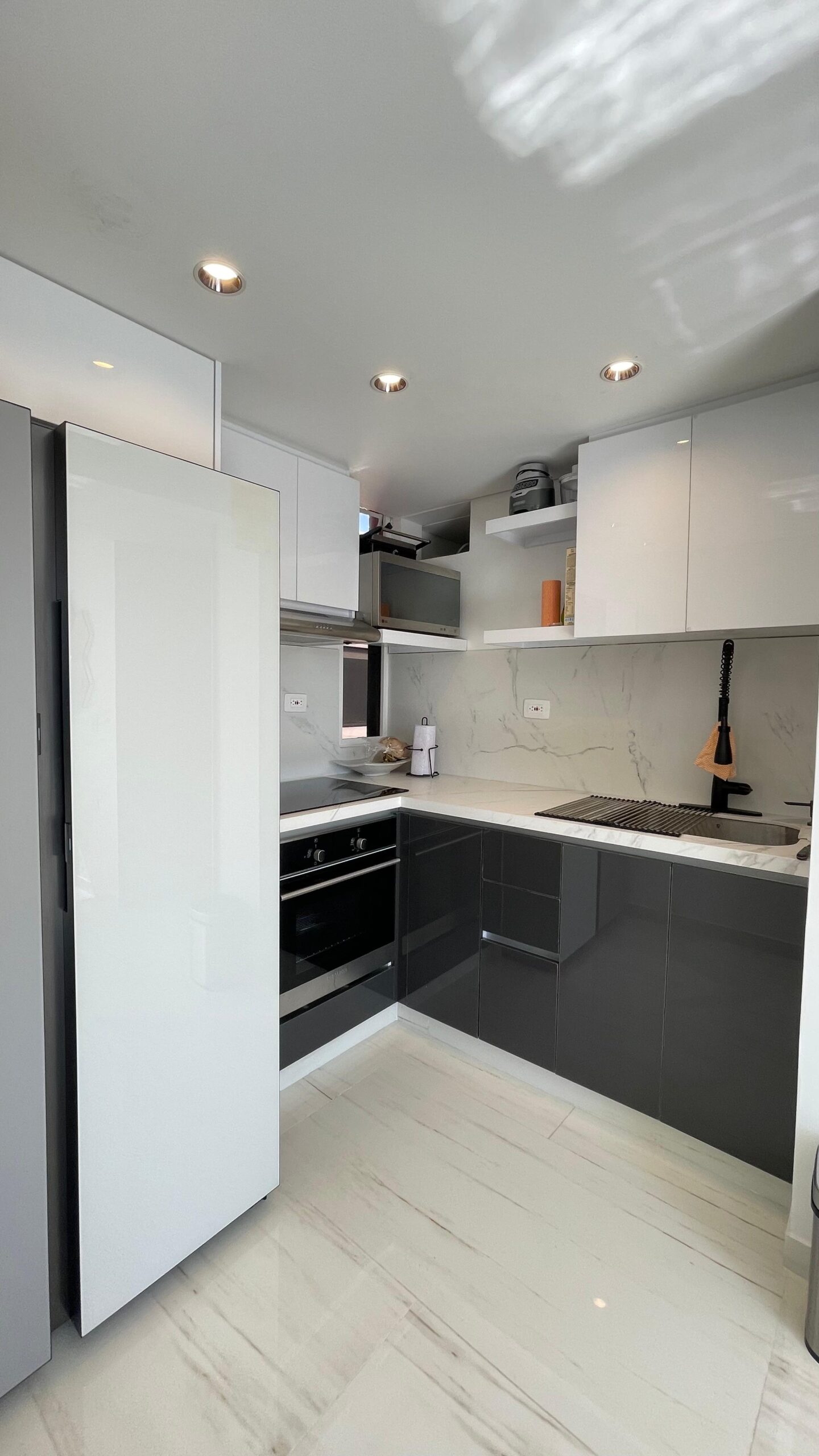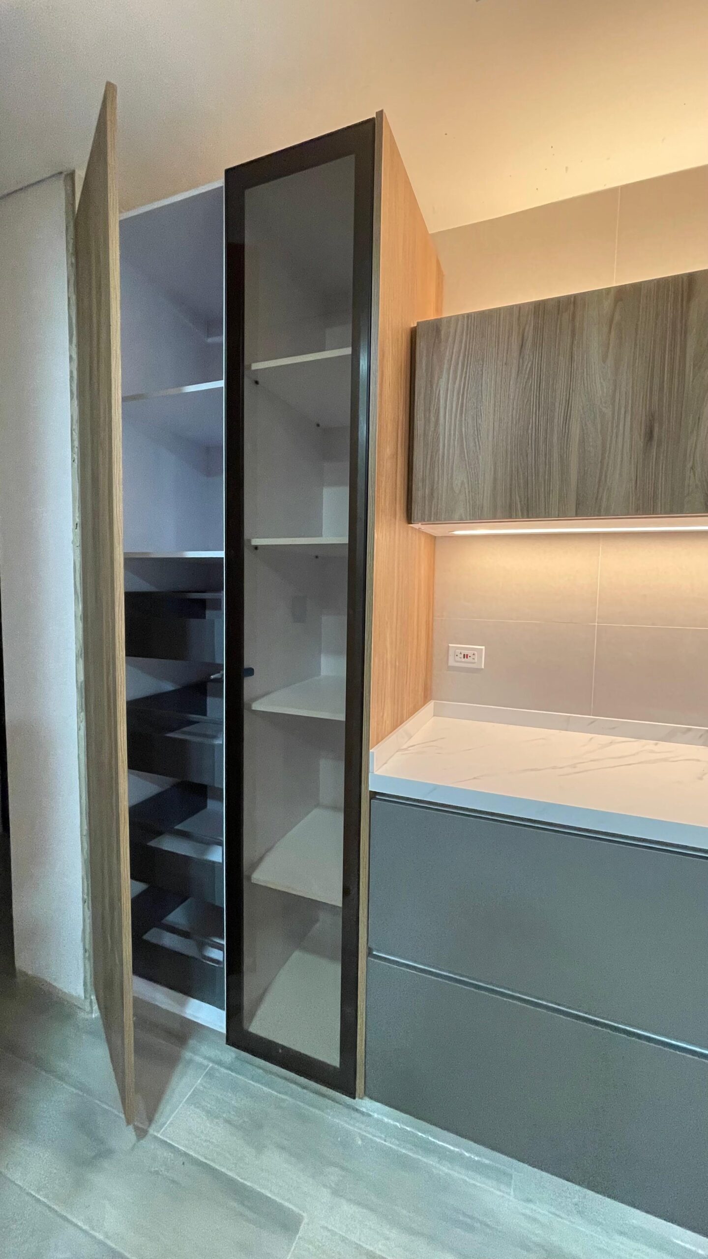 Los cajones metálicos certificados para más de 60.000 ciclos y el sistema de bisagras de cierre lento garantizan un uso prolongado. Su mesón en Quarztone, resistente a rayones y manchas, asegura fácil limpieza y larga vida útil.