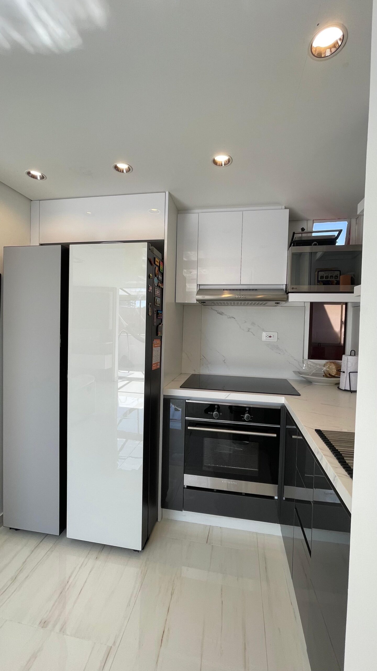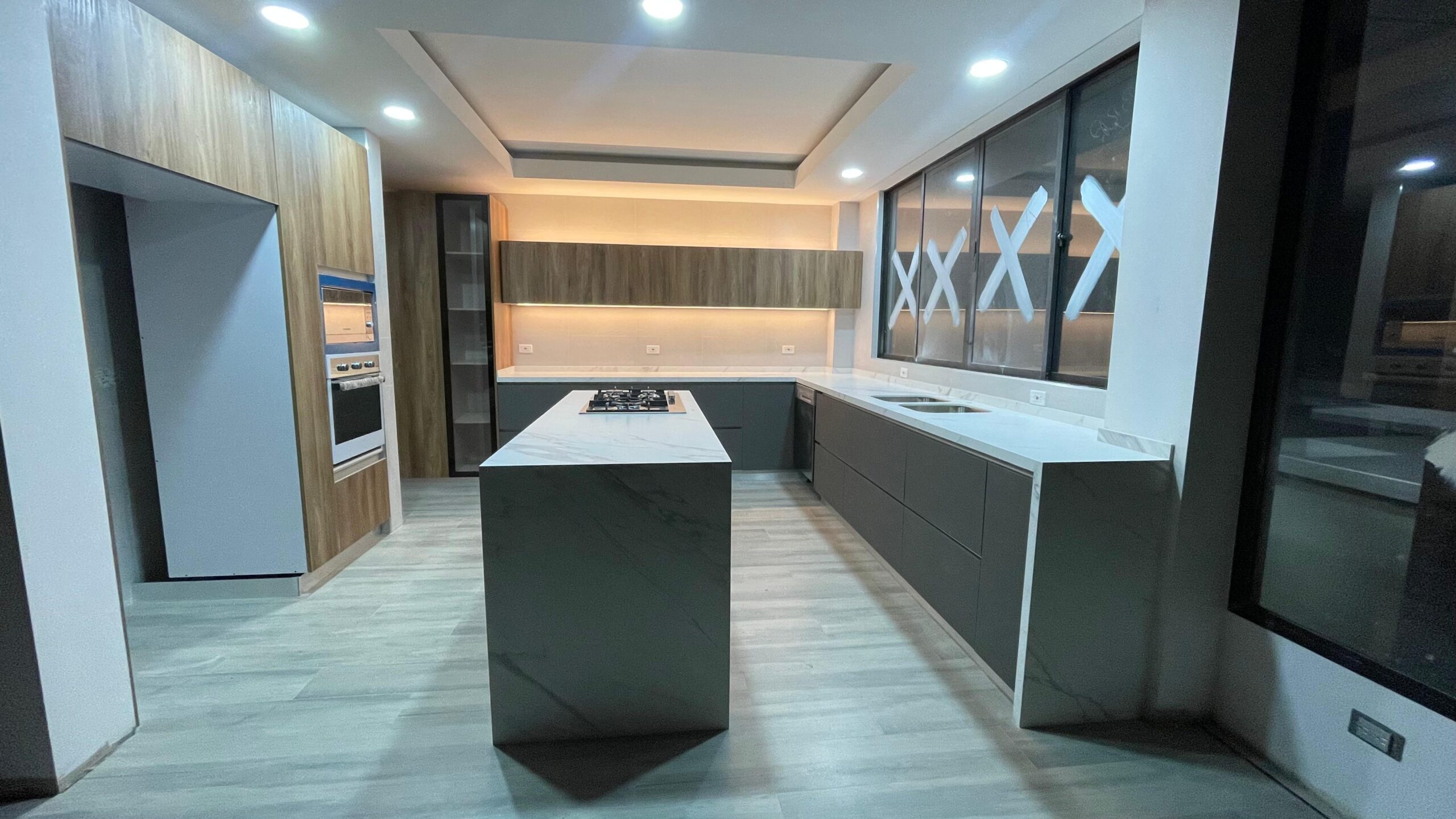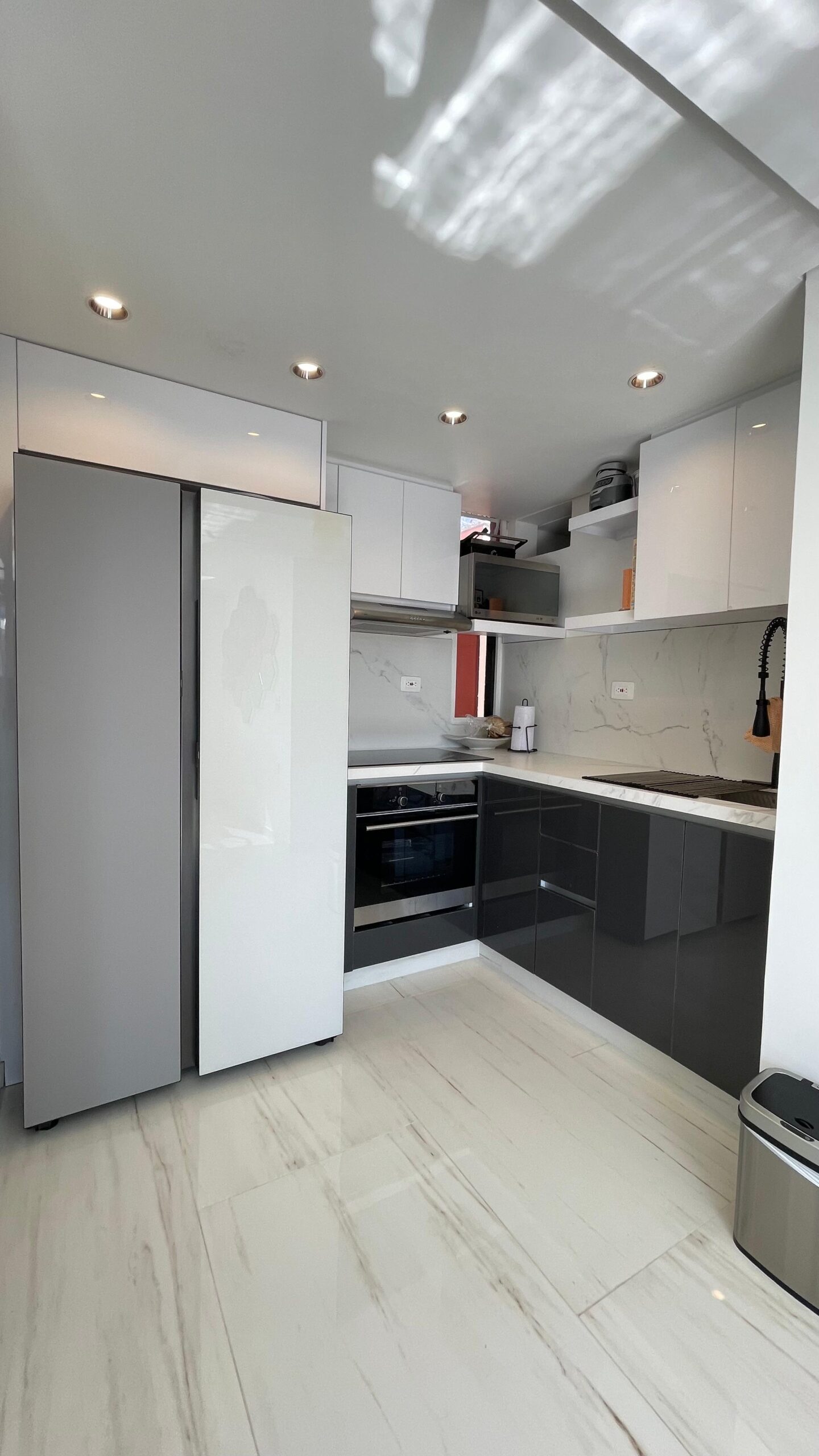 Los cajones metálicos certificados para más de 60.000 ciclos y el sistema de bisagras de cierre lento garantizan un uso prolongado. Su mesón en Quarztone, resistente a rayones y manchas, asegura fácil limpieza y larga vida útil.