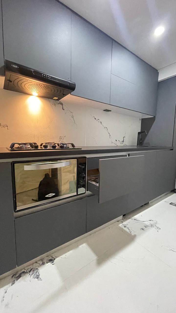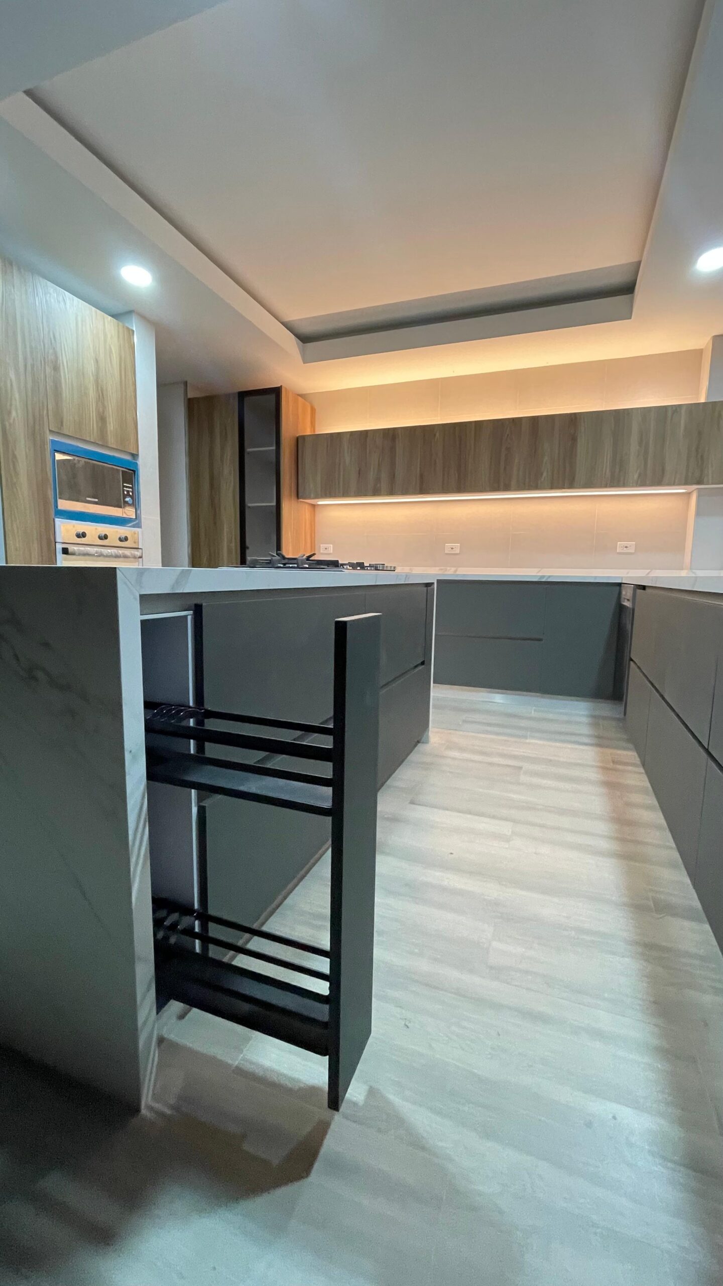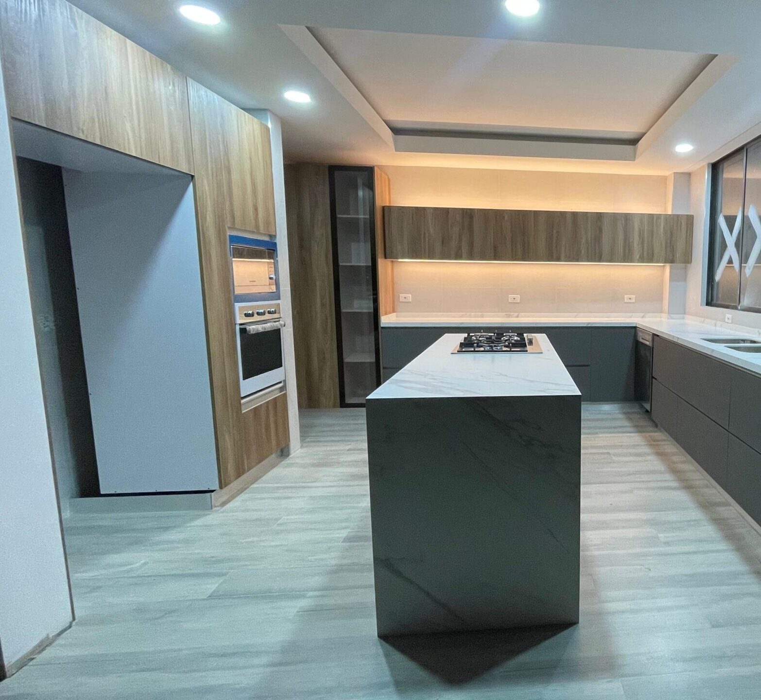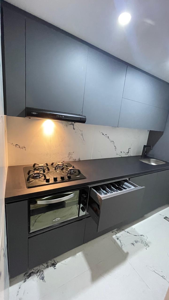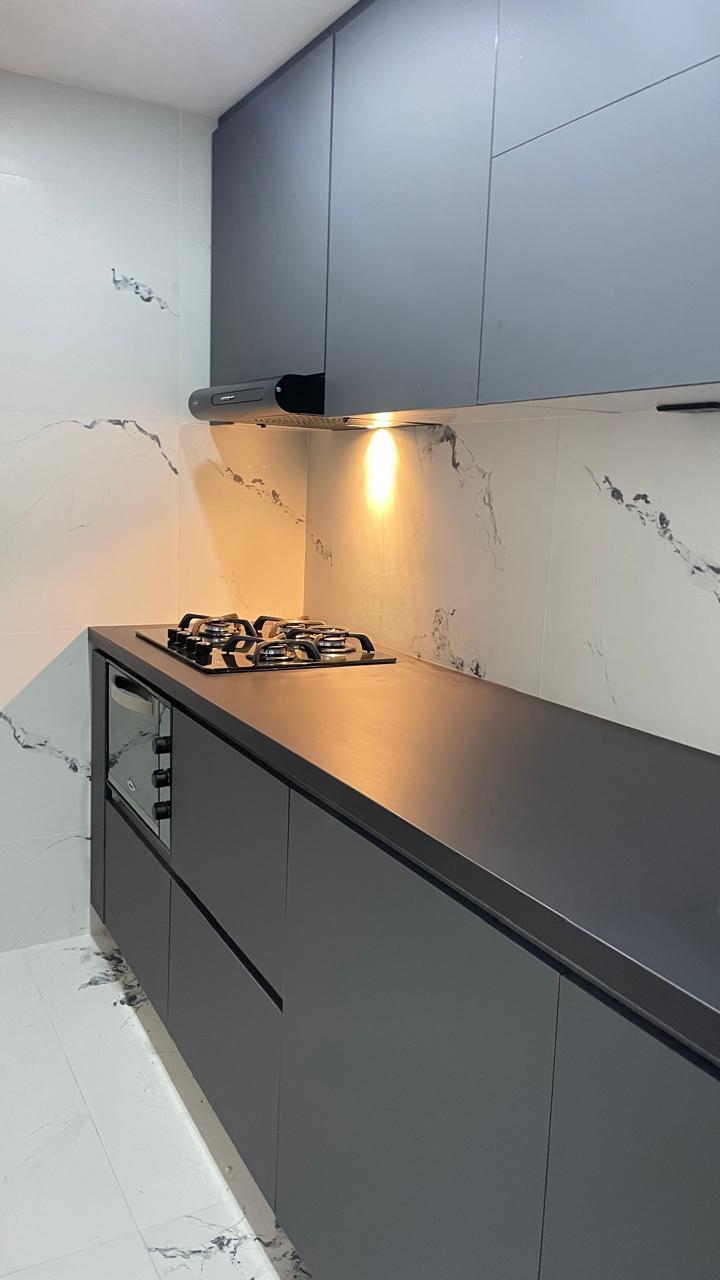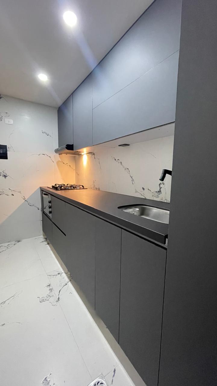 Con fachadas en MDF PVC alto brillo o MDP poro sincronizado, la Línea Esmeralda ofrece un look moderno con tacto madera y acabados brillantes. Sus muebles superiores alcanzan hasta 80 cm de altura, lo que optimiza el espacio de almacenamiento.